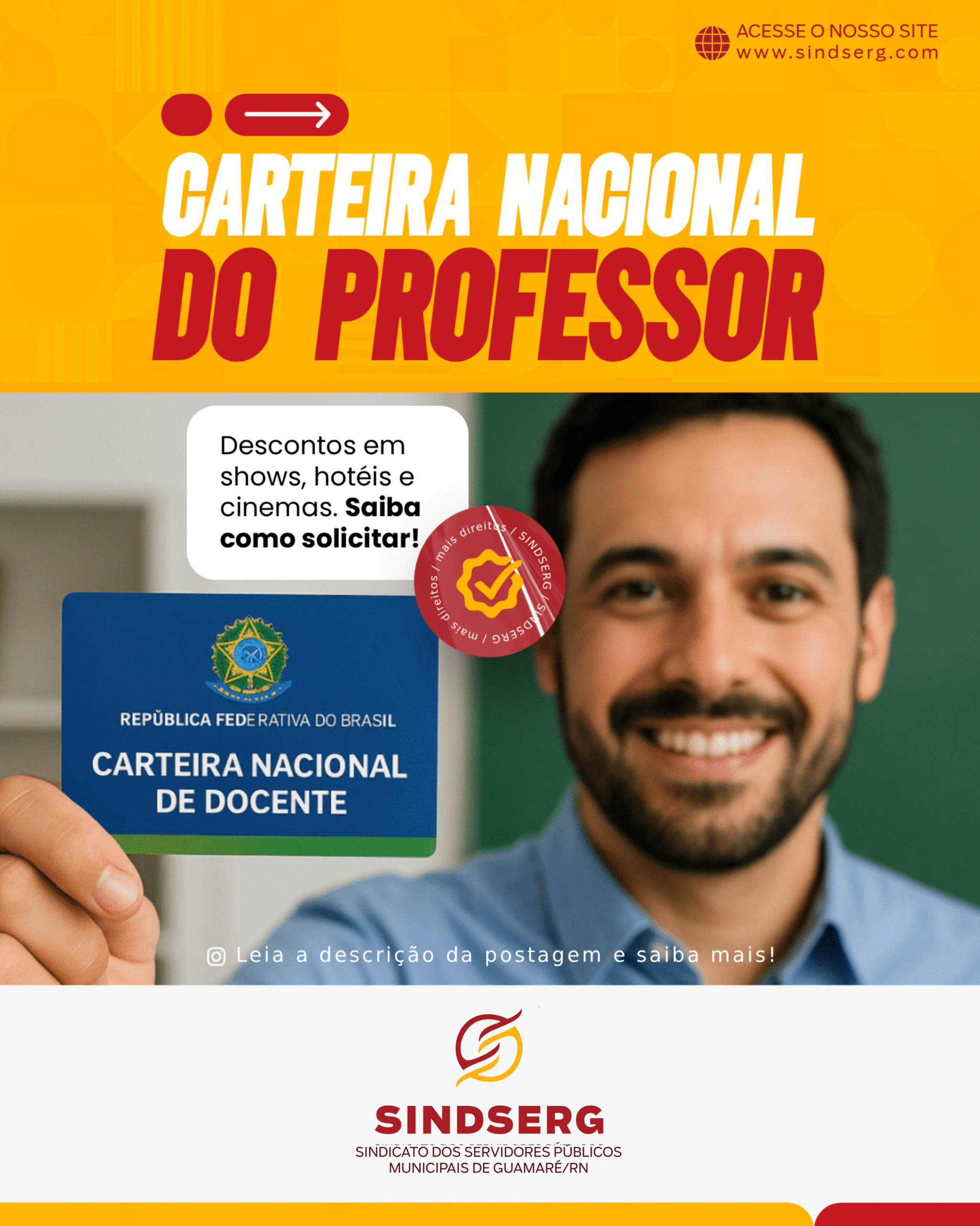 Novidade para a categoria docente! A partir de outubro de 2025, estará disponível a Carteira Nacional de Docente do Brasil (CNDB) – um documento oficial de identificação para professores da educação básica e superior, das redes pública e privada. ‍ O que é a CNDB? É um documento oficial criado pelo MEC dentro do Programa Mais Professores para o Brasil, que valoriza a profissão docente. ➡️ Reunirá dados pessoais e profissionais (nome, CPF, filiação, instituição onde atua, foto 3×4). ➡️ Terá validade em todo o território nacional. ➡️ Poderá ser emitida em versão física ou digital. Quais as vantagens? ✔️ Meia-entrada em eventos culturais (cinema, teatro, shows). ✔️ Cartão de crédito sem anuidade pela Caixa e Banco do Brasil. ✔️ 15% de desconto em diárias de hotéis parceiros (ABIH Nacional). ✔️ Outros benefícios serão anunciados oficialmente em outubro. Como solicitar a Carteira Nacional do Docente (CNDB)? ⚠️ Atenção: A solicitação só poderá ser feita a partir de 15 de outubro de 2025, quando o sistema será liberado pelo MEC. Como deverá ser feita a emissão da Carteira Nacional do Docente quando ocorrer a liberação? 1️⃣ Acesse o portal: Faça o cadastro no programa Mais Professores para o Brasil. 2️⃣ Faça login: Entre com sua conta Gov.br (CPF e senha). 3️⃣ Complete o cadastro: Informe seu tipo de vínculo de docência, município e estado onde atua. 4️⃣ Aguarde a verificação: Os dados serão checados em bases oficiais, como Receita Federal e Censo Escolar. 5️⃣ Receba o documento: Após a confirmação, a carteira será emitida em formato digital ou físico. Quando começa a valer realmente? O lançamento oficial será no Dia do Professor (15 de outubro de 2025), e somente a partir dessa data os docentes poderão solicitar a carteira. ‍‍ Importante: Os professores de Guamaré estarão aptos a emitir a carteira. ✊ O sindicato seguirá acompanhando cada etapa dessa conquista e mantendo a categoria informada.