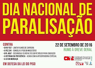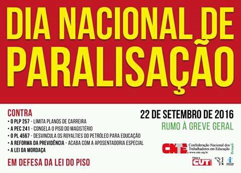 O presidente do Sindicato dos Servidores Públicos Municipais de Guamaré – SINDSERG, no uso das suas atribuições estatutárias CONVIDA todos os servidores públicos municipais de Guamaré, para no dia 22 de setembro, quinta feira, realizarmos uma grande PARADA DE ADVERTÊNCIA EM DEFESA DOS NOSSOS DIREITOS. Na ocasião estaremos realizando uma assembleia na sede do sindicato a partir da 9:00hs, para debatermos acerca da nova conjuntura politica e das ameaças ao direito adquiro por todos os servidores públicos. Lembramos que em todo o Brasil estará acontecendo esse evento denominado: “DIA NACIONAL DA PARALISAÇÃO: MUNICIPAIS EM LUTA, RUMO A GREVE GERAL”! Neste dia, vamos todos juntos dizer NÃO ao: PLP 257 – que impede reajuste salarial acima da inflação e limita os Plano de Cargos Carreiras e Salários; SOMOS CONTRA: PEC 241– Fim da obrigatoriedade do percentual de investimentos em educação e saúde; que limita por 20 anos o aumento em gastos públicos. PL 4567 – Desvincula os royalties do petróleo para educação, impossibilitando as metas do PNE; REFORMA DA PREVIDÊNCIA – Acaba com a aposentadoria especial e aumenta a idade mínima para a aposentadoria. A luta em nível municipal, vamos exigir também o calendário de pagamento para todos os servidores efetivos municipais.